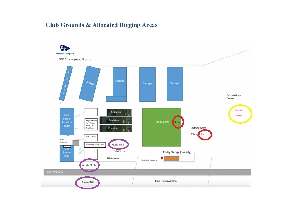 Rigging areas are shown on the left. Musto Skiffs are marked in purple, B14s are marked in red. The yellow circle indicates overflow rigging area available to both classes. Please do not leave trolleys on the ramp, but put them in the marked storage area.