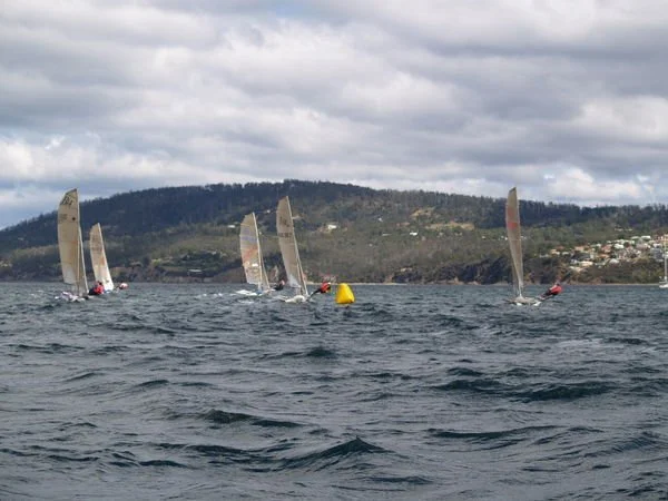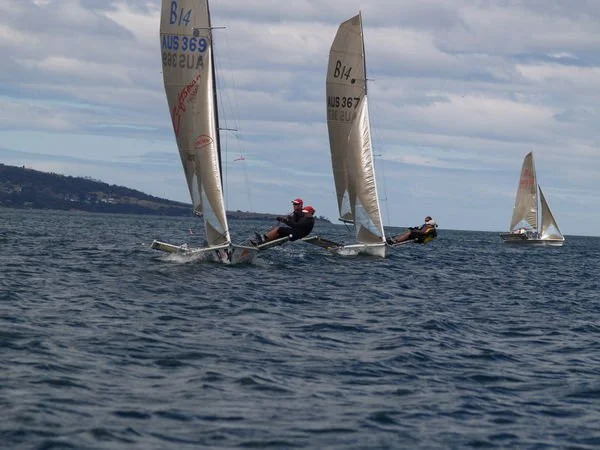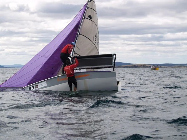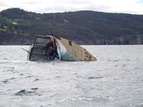 Oops! The Hitcher sailed by Robbie Hunt and David McAully questioning their new "I'm not getting wet" position in the first of 4 races at day 2 of the Tasmanian State titles. Photo: Earl Westbury