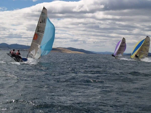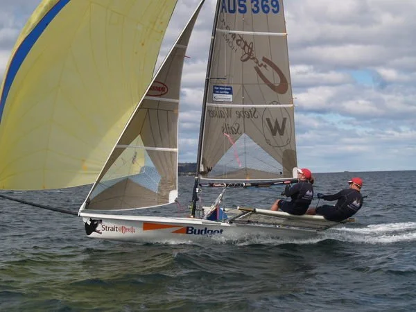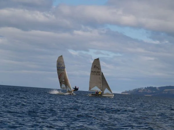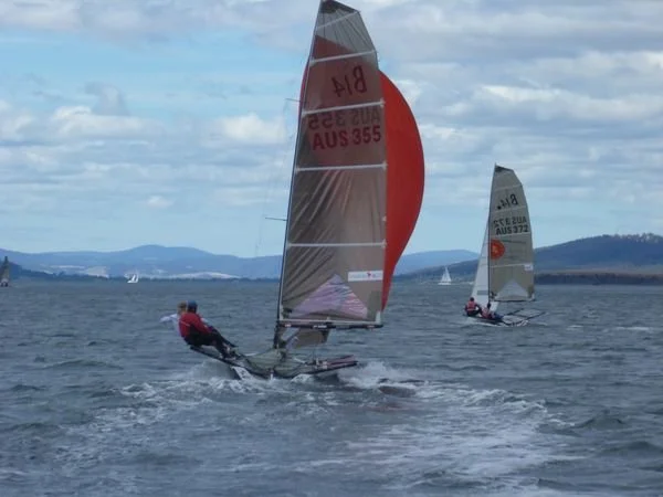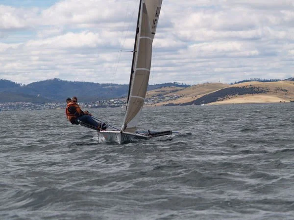 Hang on Boys! The Hitcher sailed by Robbie Hunt and David McAully rocketing downwind in the first of 4 races at day 2 of the Tasmanian State titles. Photo: Earl Westbury