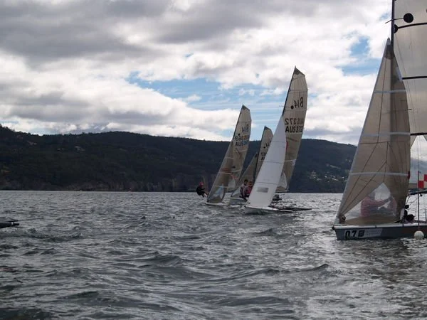 Fleet view: The Hitcher sailed by Robbie Hunt and David McAully hot off the line in race 6 at day 2 of the Tasmanian State titles. Photo: Earl Westbury