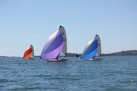 In a light northerly sea breeze, racing began on day 3 of the nationals. With a clean start from all competitors the fleet quickly sorted itself out, with The Nude’s Ritchie Reynolds and Lisa McMillan taking the early lead and capitalising on their light crew weight. They rounded the top mark with Guy Bancroft and Lachie Imeneo hot on their heels. The Tasmanian crew of Chris Wells and Rani Dabner sailed a fantastic first beat rounding in third place and giving themselves a very good chance to move up through fleet. Only a few spots back were Stephen Mitchell and Adrianne Daley sailing Bondi Tram, the crew were struggling early in the series in the stronger wind however made the most of the light conditions to round the top mark in 5th.