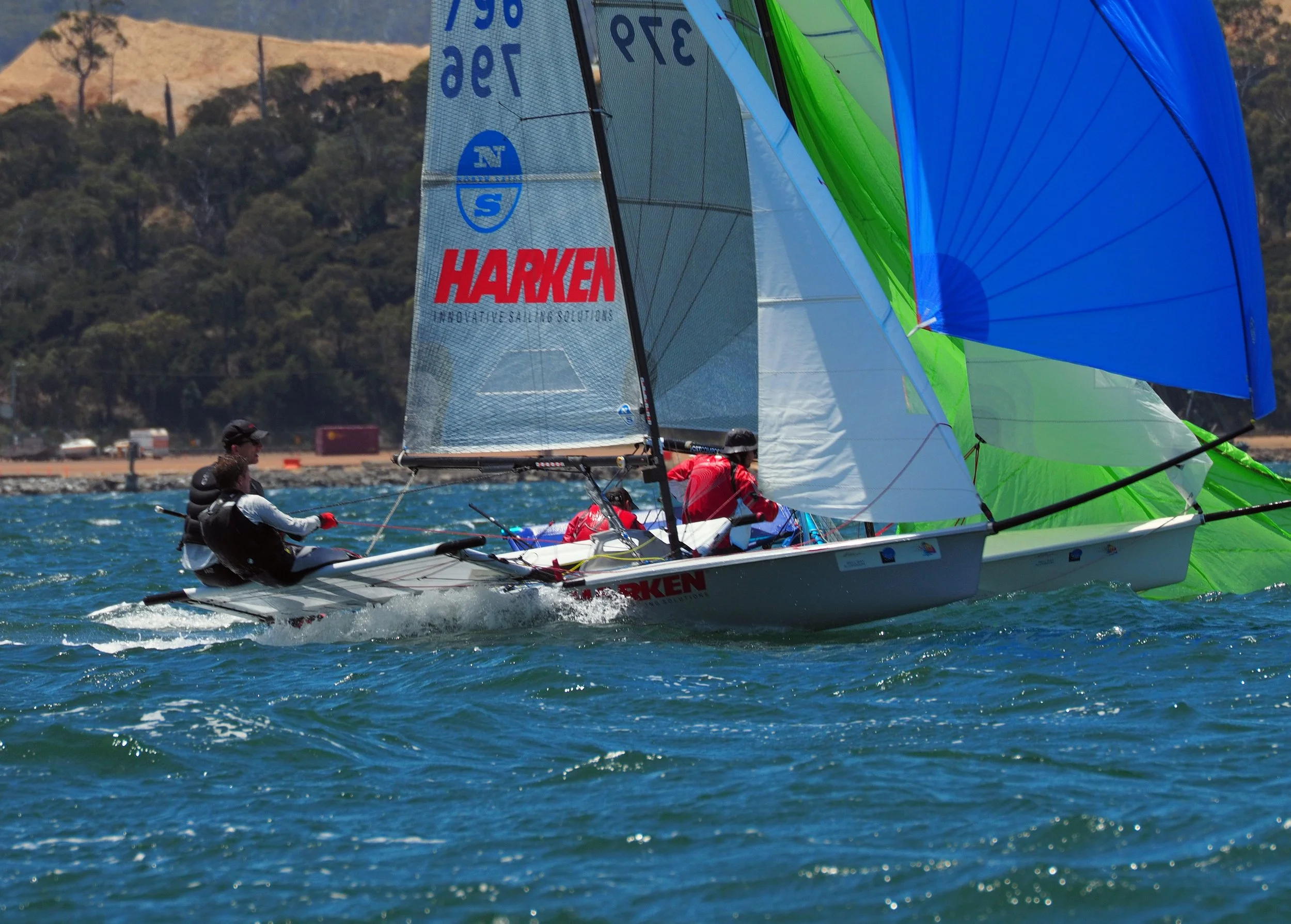 First to round was Harken/Sandline, followed closely by 5 others including Bonework, Bonus, The Hitcher, Snatch & Rocketship. The bearaway claimed its first victim being Bonework. Most boats hit the right side of the course and Harken extended their lead after hooking into a great gust down the first run. Rocketship, recently crowned Australian Champions, were the next victims swimming in the Tamar on the gybe. By the bottom gates the fleet had spread considerably with Harken leading followed by Hitcher, Snatch and Bonus. Fleet lightweights Reynolds and McMillan in the Nude who were 5th at the bottom gate which is a terrific effort considering their 130kg combined weight some 30+kg lighter than their closes competitors.