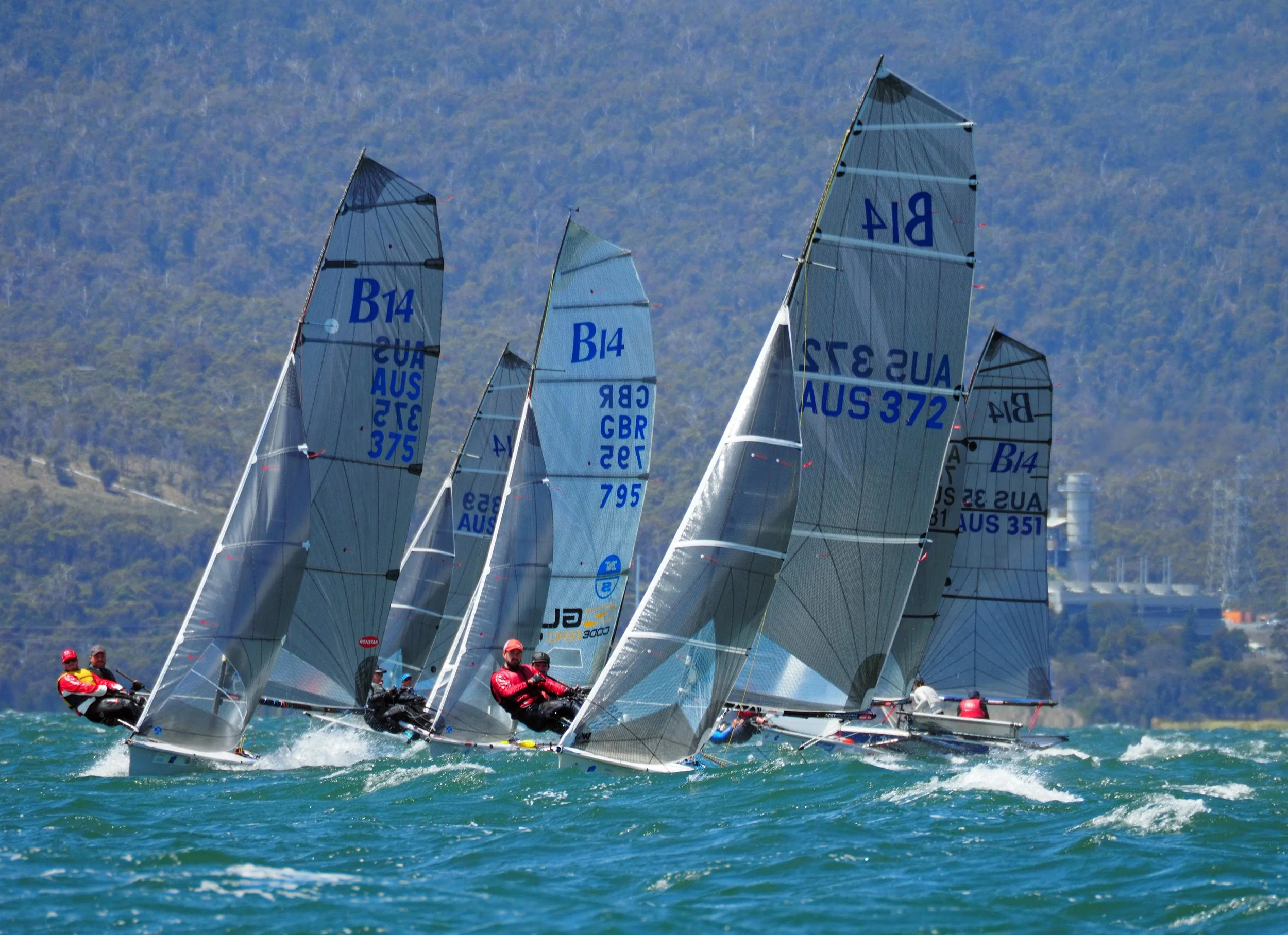 Race 1 of the Tamar Cove CST Composites, B14 World Championships. The breeze was building, and started at around 15 to 18 knots.