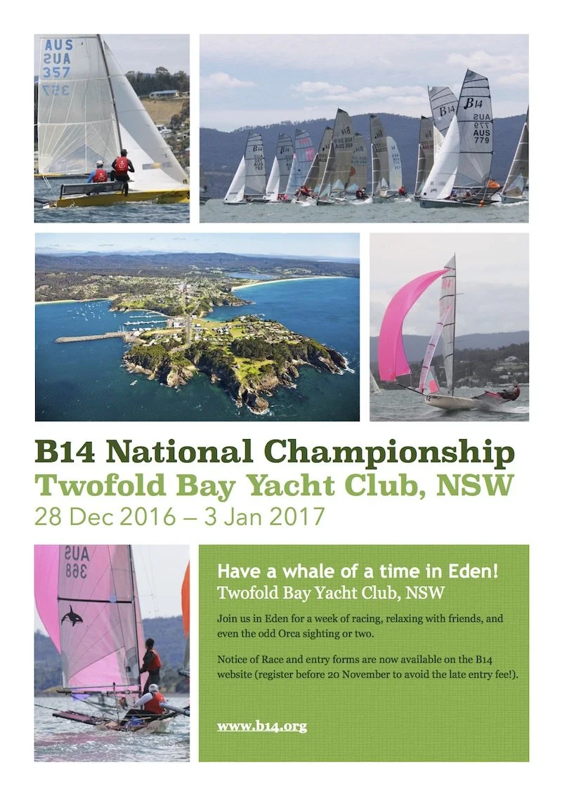 With just over 50 days to go before the 2016-2017 edition of the Australian B14 National Championship, it's time to dust off those vessels, send in those entry forms, and sort out accommodation if you haven't already done so!