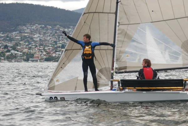 Pictured Right, Luke Cripps Skippered the boat "Blow Me" with crew Sam Cannamela. Halfway through the regatta by an unknown source a new name appeared upside down on the hull, "The Turtle" for obvious reasons during the National and World Championships in Hobart, Tasmania 2009.