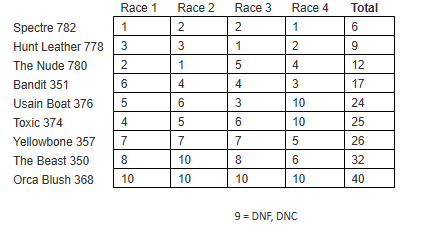 There was a great turn out with 9 boats in attendance making for some good competitive racing. Spectre, fresh from Garda, lead the field with Hunt Leather, The Nude and Bandit in close pursuit all day. Extremely close racing between Usain Boat, Toxic and Yellowbone with only 1 point separating them, The Beast showing grit and determination improving placings throughout the series. Early in the first race Orca Blush had gear failure which took them out of the days racing. And rumour has it that for the 2nd time only in B14 history Richie (not Lissa) raised his voice at another competitor!