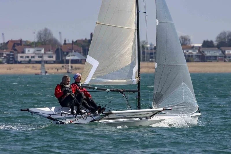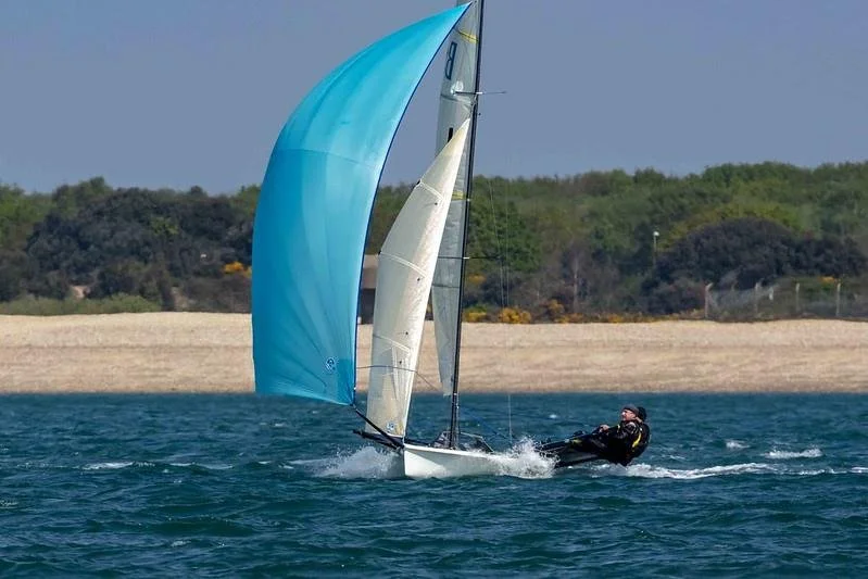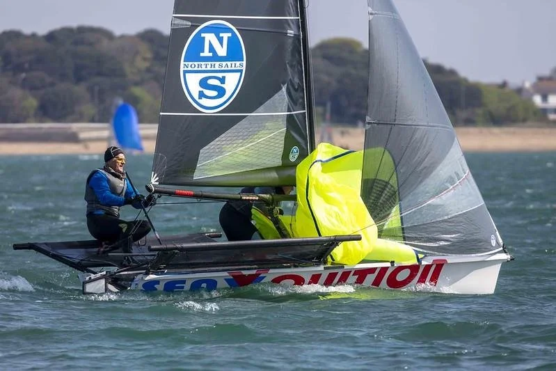 Out of the B14s it was between Blue Badge (Mike Bees/Martin Worth) and Team Seavolution/North Sails (Mark Barnes, Charlotte Horlock). Blue Badge initially led the charge, but Seavolution/North Sails arrived at the windward mark first. Then the leg to the outer course followed by some fast downwind sailing under kite where both were blown deeper off the course in a monster gust, so dropping early with advantage to Blue Badge. Lap 2 the lead changed again with Blue Badge giving chase. Down the next run, Seavolution/North Sails pulled out a bit more of a lead. Unbeknown to the fleet the leeward mark was drifting and had come close to the start pin rib. As Seavolution/North Sails came in full bore, dropping their kite, the rib ended up to windward in the vicinity of the drifting buoy whilst heaving their anchor. Seavolution/North Sails spun out during the drop staying upright but trawling their kite. Kite retrieved, then spun round to give chase to Blue Badge. Over the next lap the gap closed but Blue Badge held firm and took the win. The rest of the B14 fleet took several swims and headed home all in one piece, deciding it was time to do some bimbling.