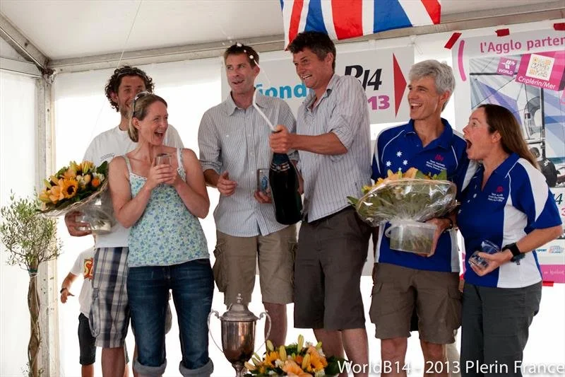 The presentation of the Worlds Trophy and B14 ashes was hosted by local Plerin and Brittany dignitaries with another massive bottle of champagne this time successfully negotiated by Tim and as a rare occurrence, signifying the magnitude of the event, it was even enough to prompt Tim to make a speech and bring a small tear to Johnny's eyes.