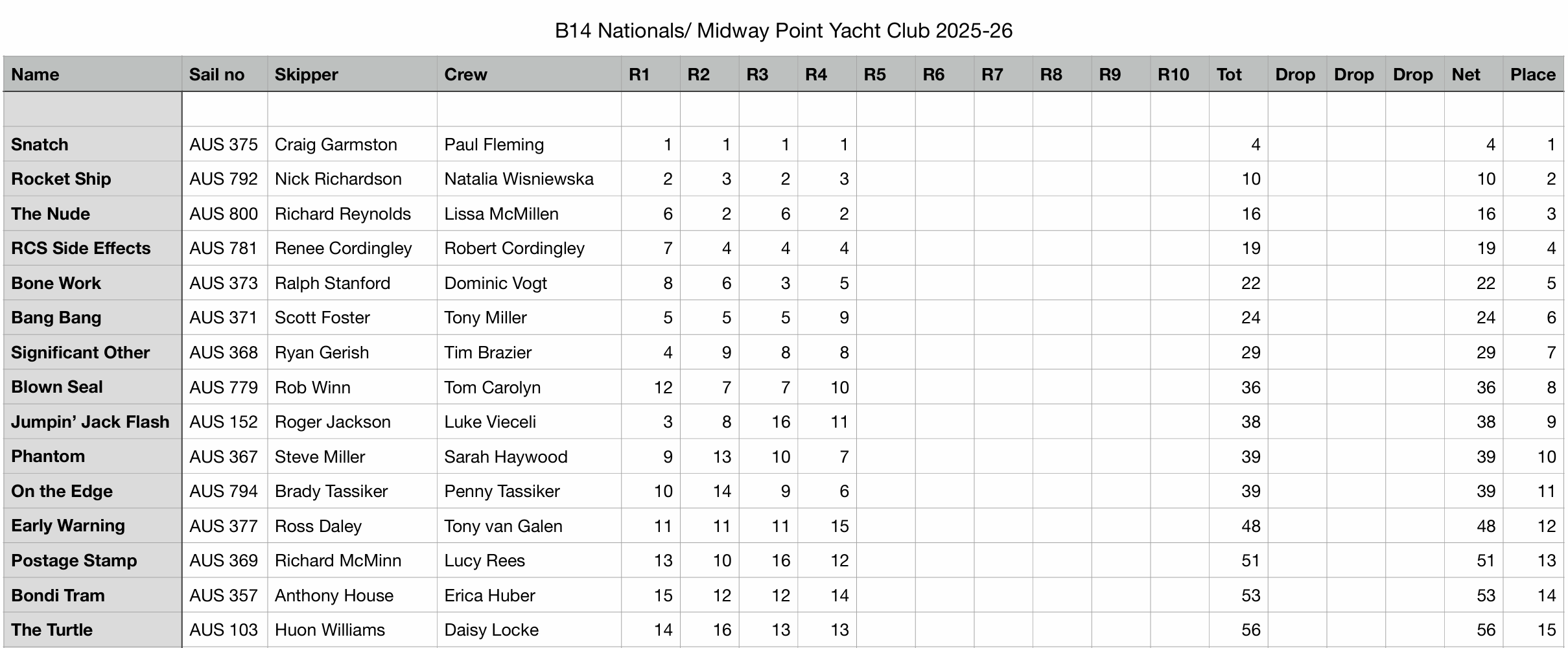 Check out the full results here: B14 National Titles 2025-26 - Midway Point Yacht Club